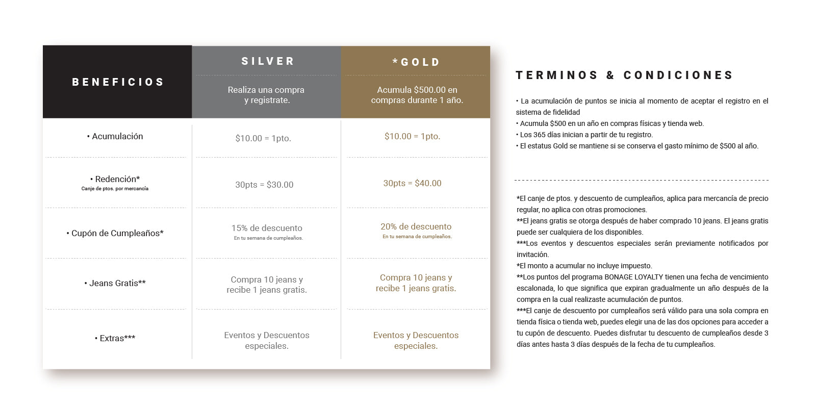 BONAGE LOYALTY, es un programa de lealtad de BONAGE, cuya razón social es DENIM RETAIL GROUP, S.A., de C.V., está diseñado para generar una experiencia de compra completa para nuestros clientes frecuentes y distinguir su fidelidad a través de la recompensa a su lealtad. Con cada una de tus compras estarás acumulando puntos con los cuales podrás pasar a formar parte de nuestro club de clientes Silver y Gold, cada uno de estos estatus te brindaran la posibilidad de acceder a: